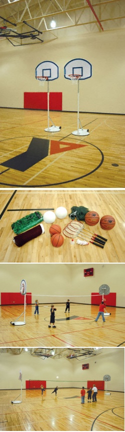 Finally, someone has created an all in one unit! Use one set of modified game standards to play basketball, wolleyball, and badminton. Designed for ease of use, the basketball backboards don;t even have to come off when you want to play volleyball od badminton- they rotate 180 degrees for unobstructed play! The game standards way 129lbs. each and require you to add 4 bags od 60lb. premix concrete in the rear ballast to ensure safety. Powder coat finish keeps standards free from straches and rust. The basketball backboard is molded graphite, measures 36.5" x 49" and comes equipped with a single steel rim. Unit adjusts height from 6' to 8' in 6" increments. The included volleyball and badminton nets have rope cables with simple, secure net tensioning for heights 6' to 7'4". The Instant Gym includes: 2 steel game standards with adjustable height backboard and goal, one official size 32' wide volleyball net, one official size 20' wide badminton net, 4 steel badminton racquets, six shuttlecocks, two synthetic official sized basketballs, two rubber junior basketballs, two official size rubber volleyballs and a mesh bag to sore and carry the accessories. Complete unit weighs about 500 lbs. Ships by truck.